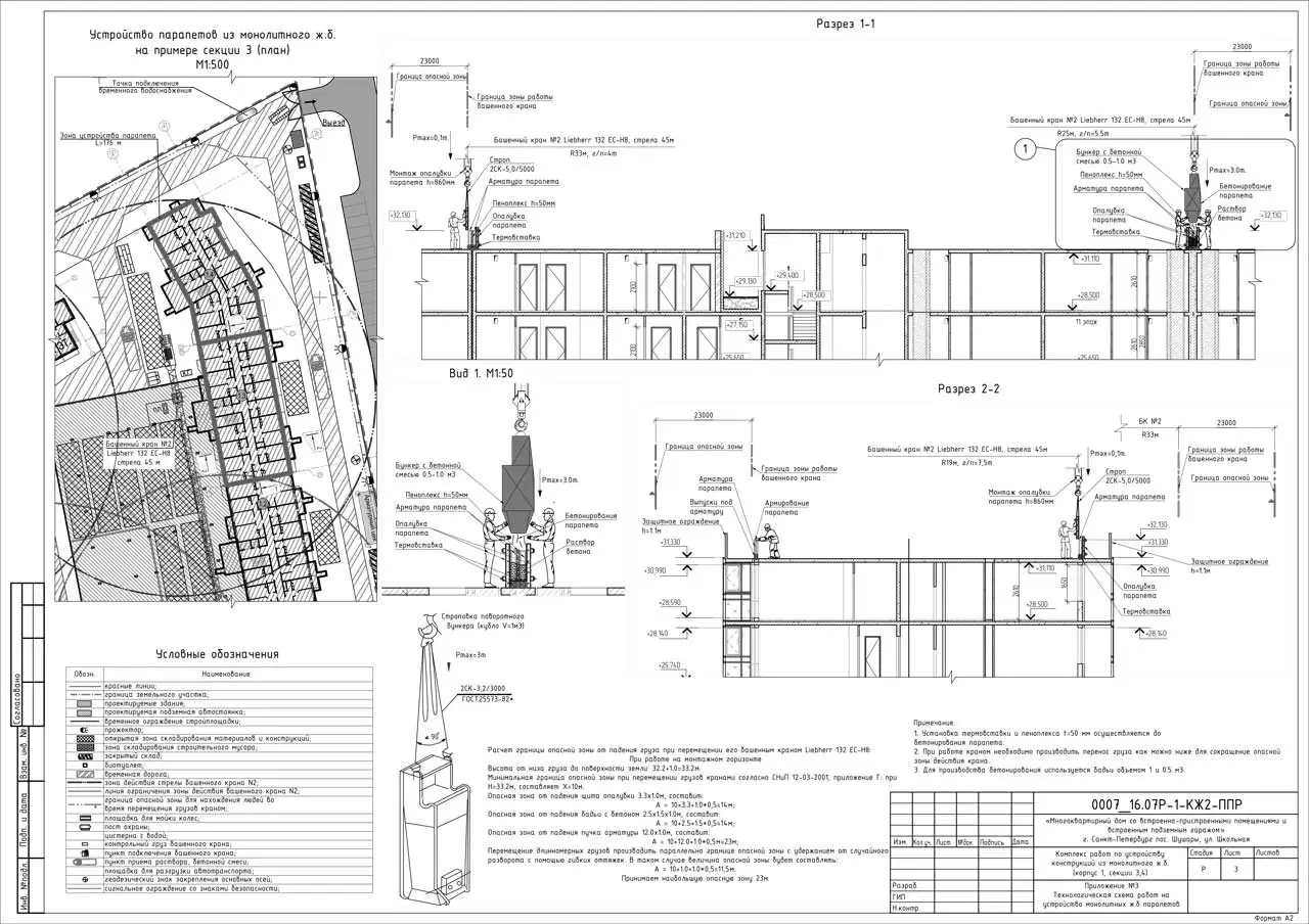 В графической части к данному проекту был разработан строительный генеральный план, чертежи производства работ по этапам, технологическую схему работ на устройство монолитных железобетонных парапетов, схемы строповок и складирования.