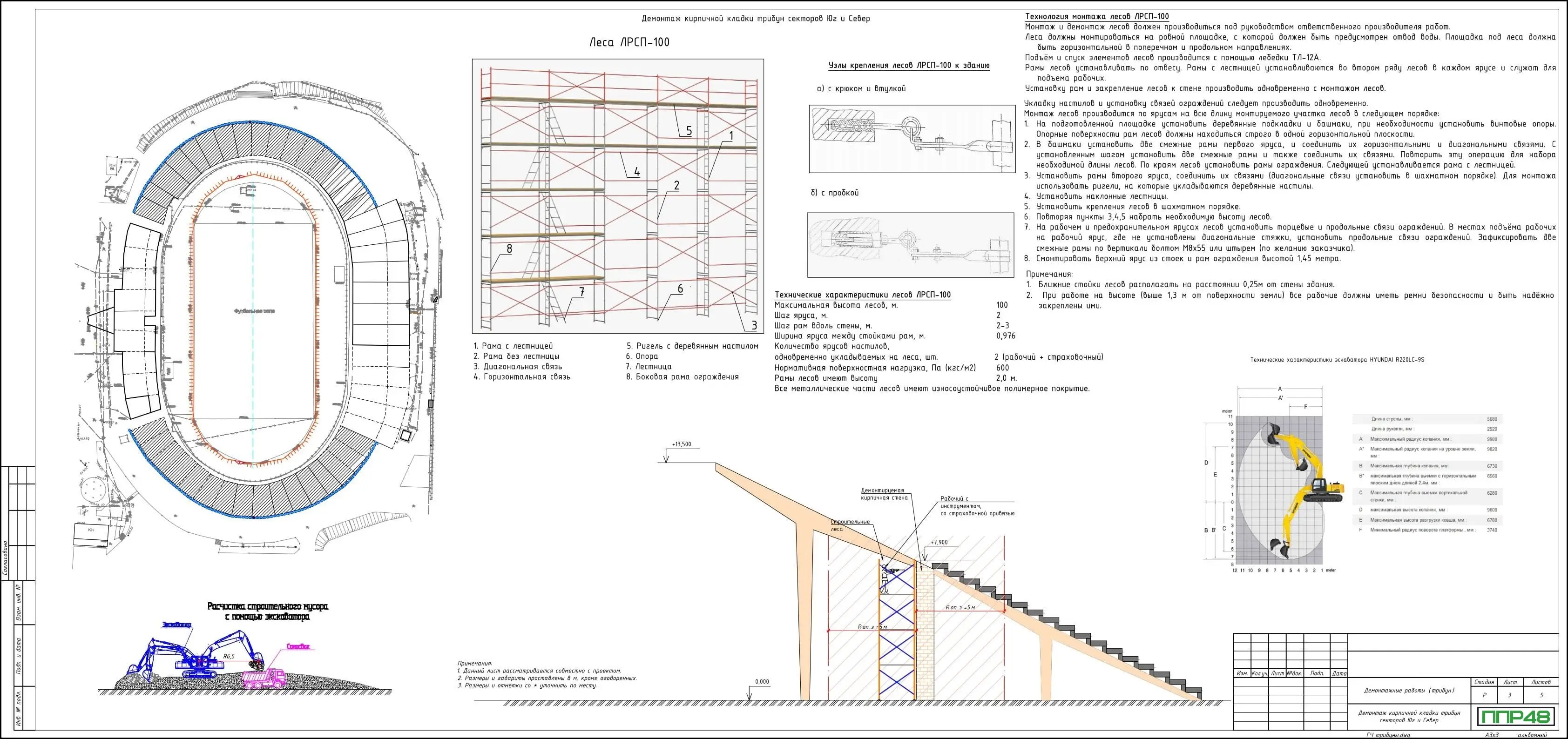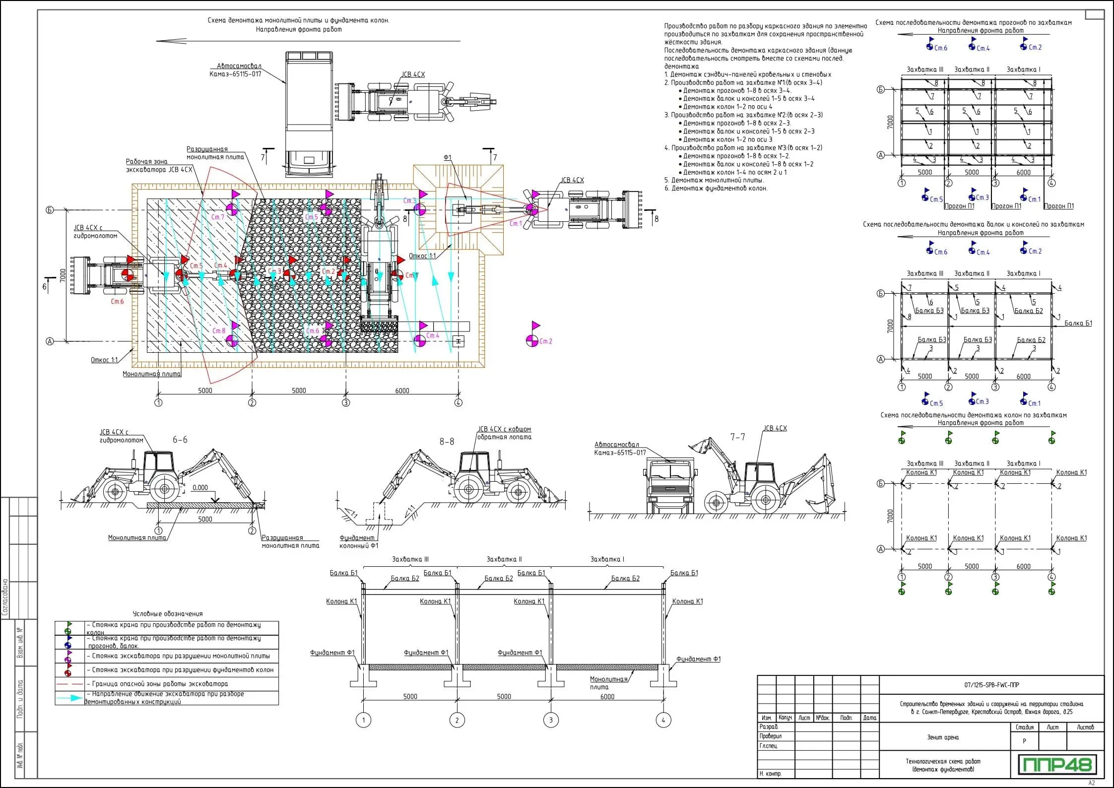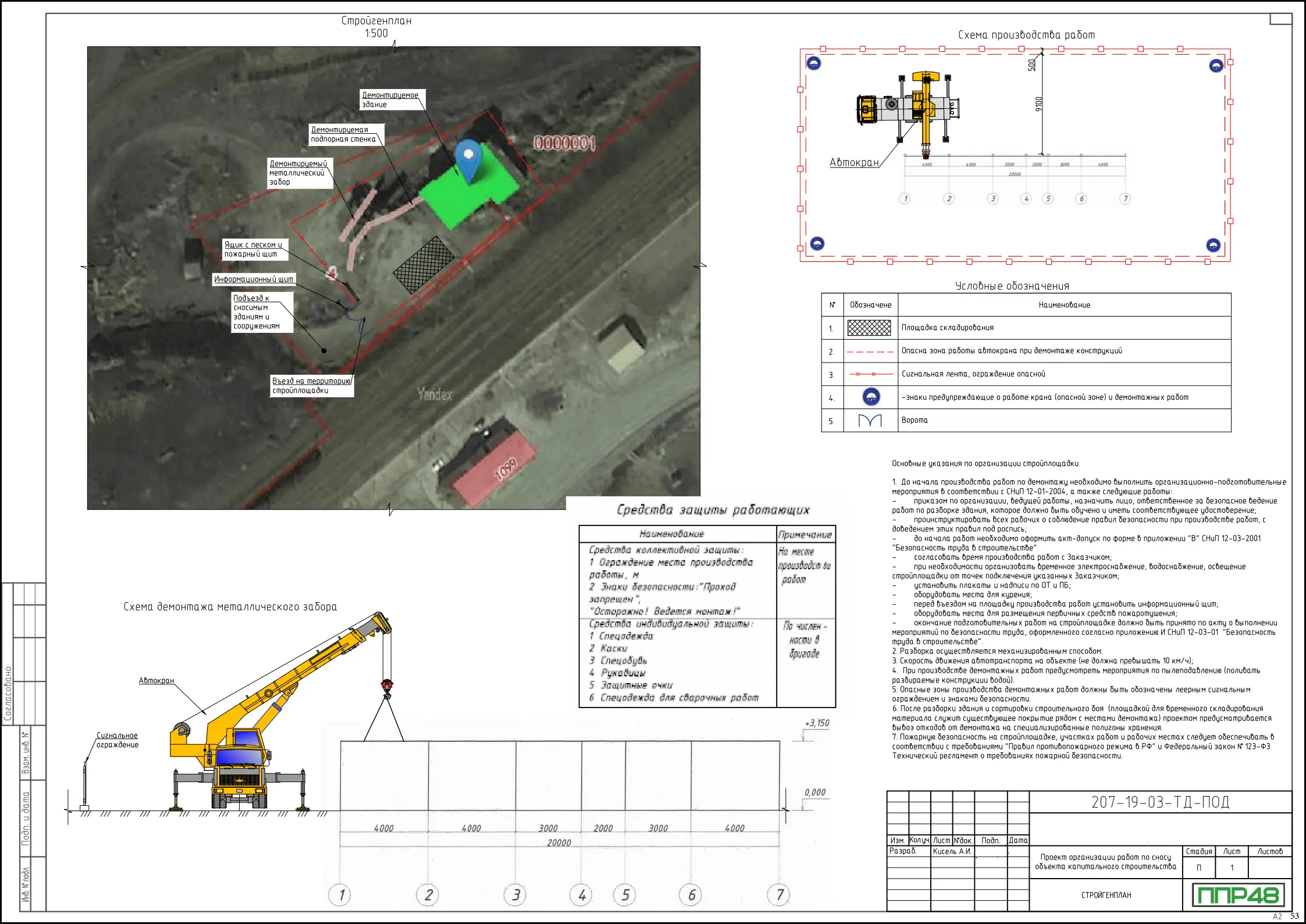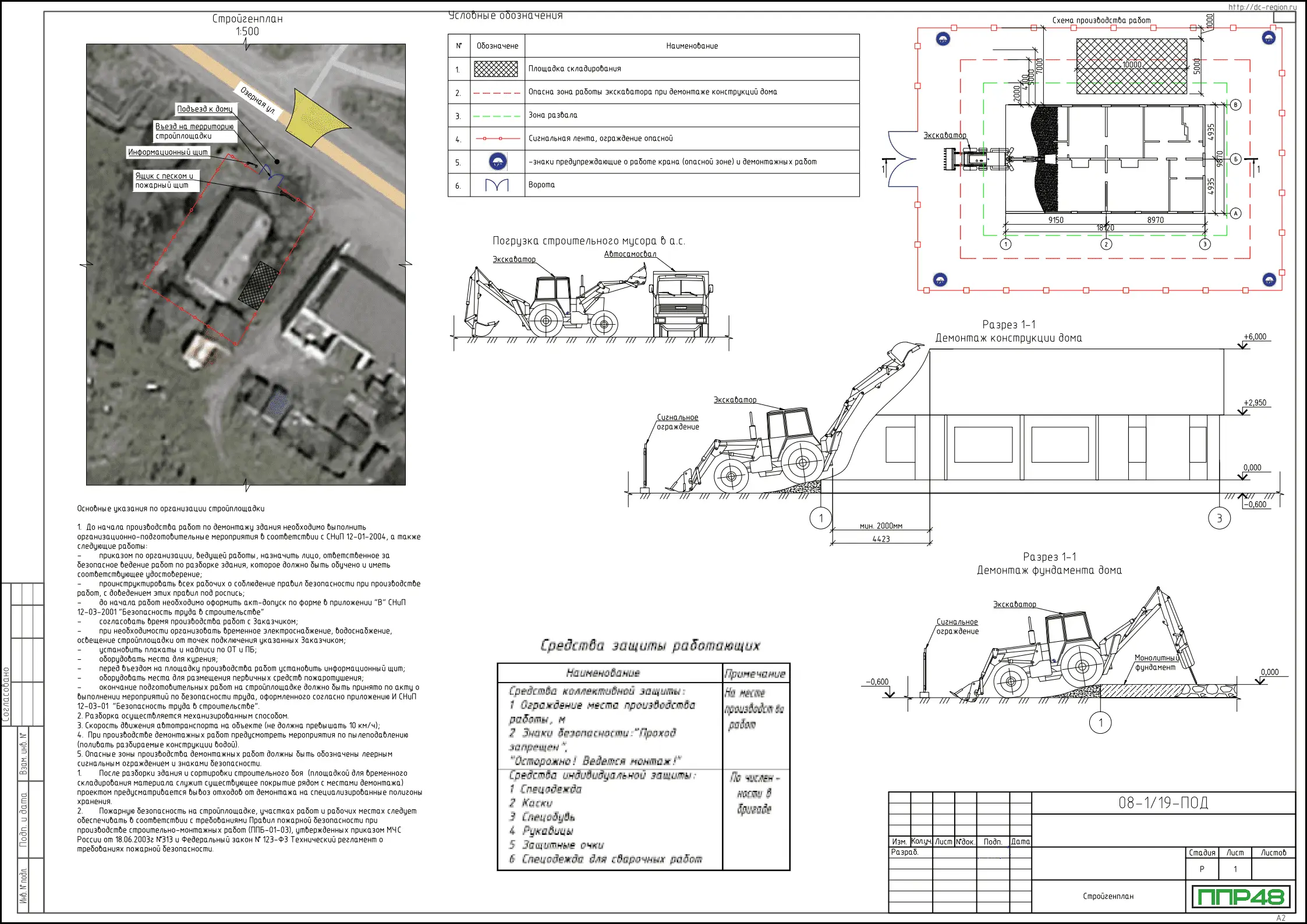 Проект производства работ на демонтаж объекта и его сноса разрабатывается на основе проекта по сносу (ПОД) и прочих исходных материалов . Количество разрабатываемых ППР должно соответствовать кол-ву заданий, обозначенных в ПОД. В процессе разработки ППР при демонтажных работах рекомендуется учитывать положения из СТО НОСТРОЙ 2.33.53-2011. Важной целью проекта является обеспечение безопасности при выполнении демонтажных работ. Поэтому в его состав включают раздел по охране труда при демонтаже и сносе конструкций. Данный раздел должен учитывать опасные ситуации, возникающие вследствие обрушения демонтируемых конструкций при сносе, предусматривать меры по их устранению. Для того, чтобы сохранить зеленые насаждения, находящиеся в зоне осуществления технологических операций при сносе, в документ следует включить раздел по охране окружающей среды.