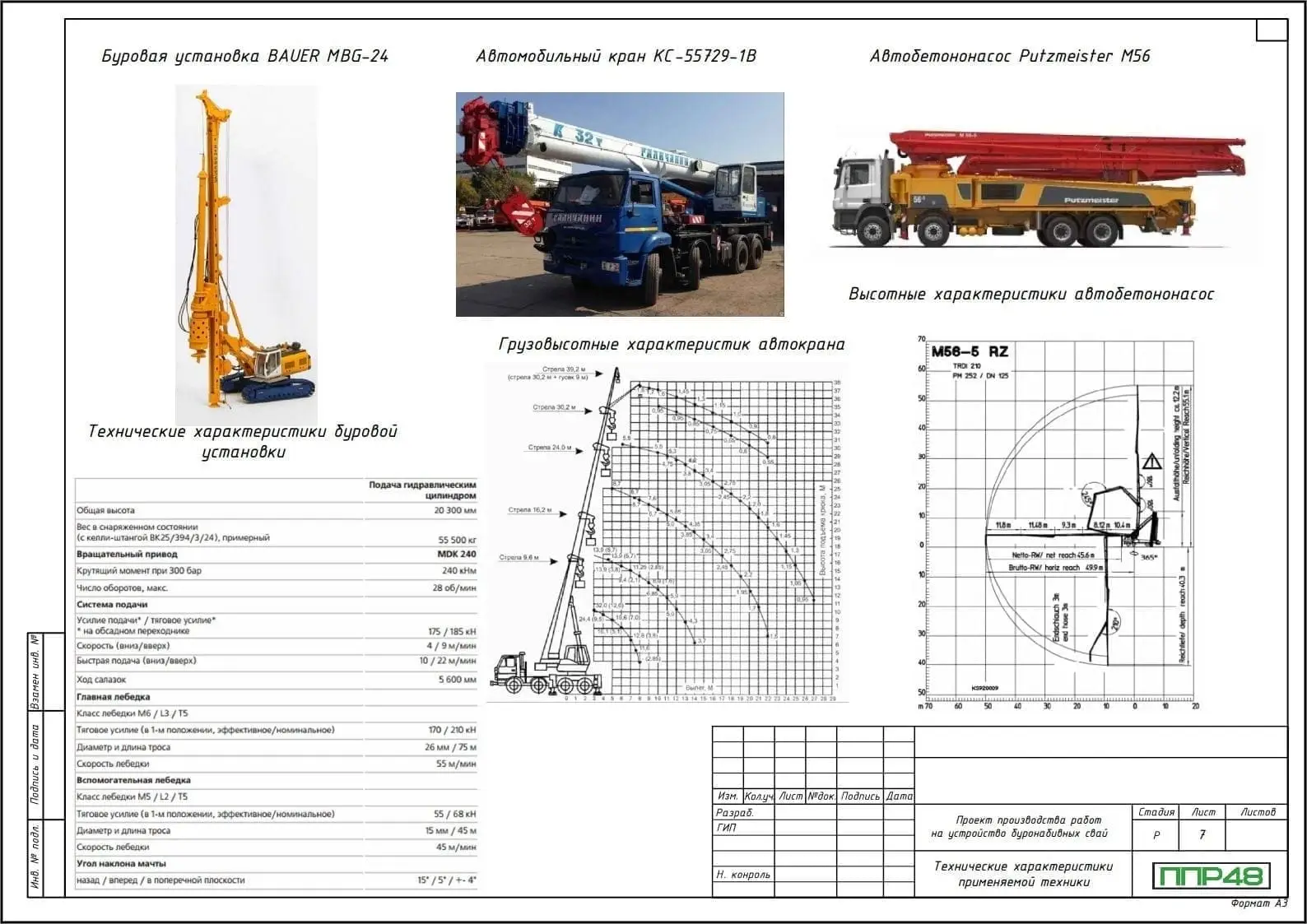 • Перечень и характеристики строительной техники (сваебойные установки, буровые машины, краны, компрессоры и др.);