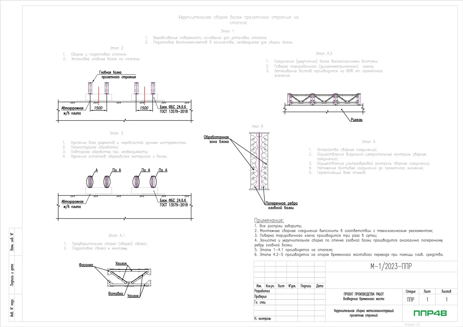 ППР для ж.д. моста, кроме расширенного содержания, где учитывают статическую схему и технологию сборки пролета, требует дополнительного согласования с руководством железной дороги. Кроме этого, проект должен предусмотреть повышенные меры безопасности, связанные с эксплуатацией железнодорожного транспорта.