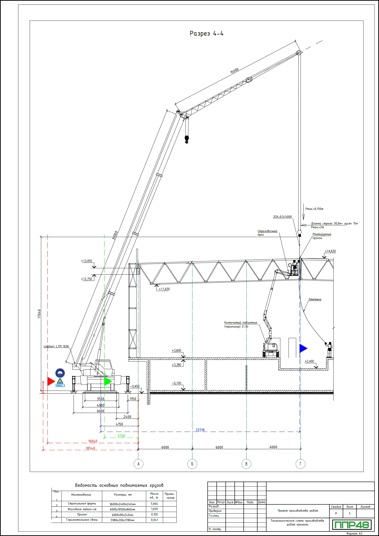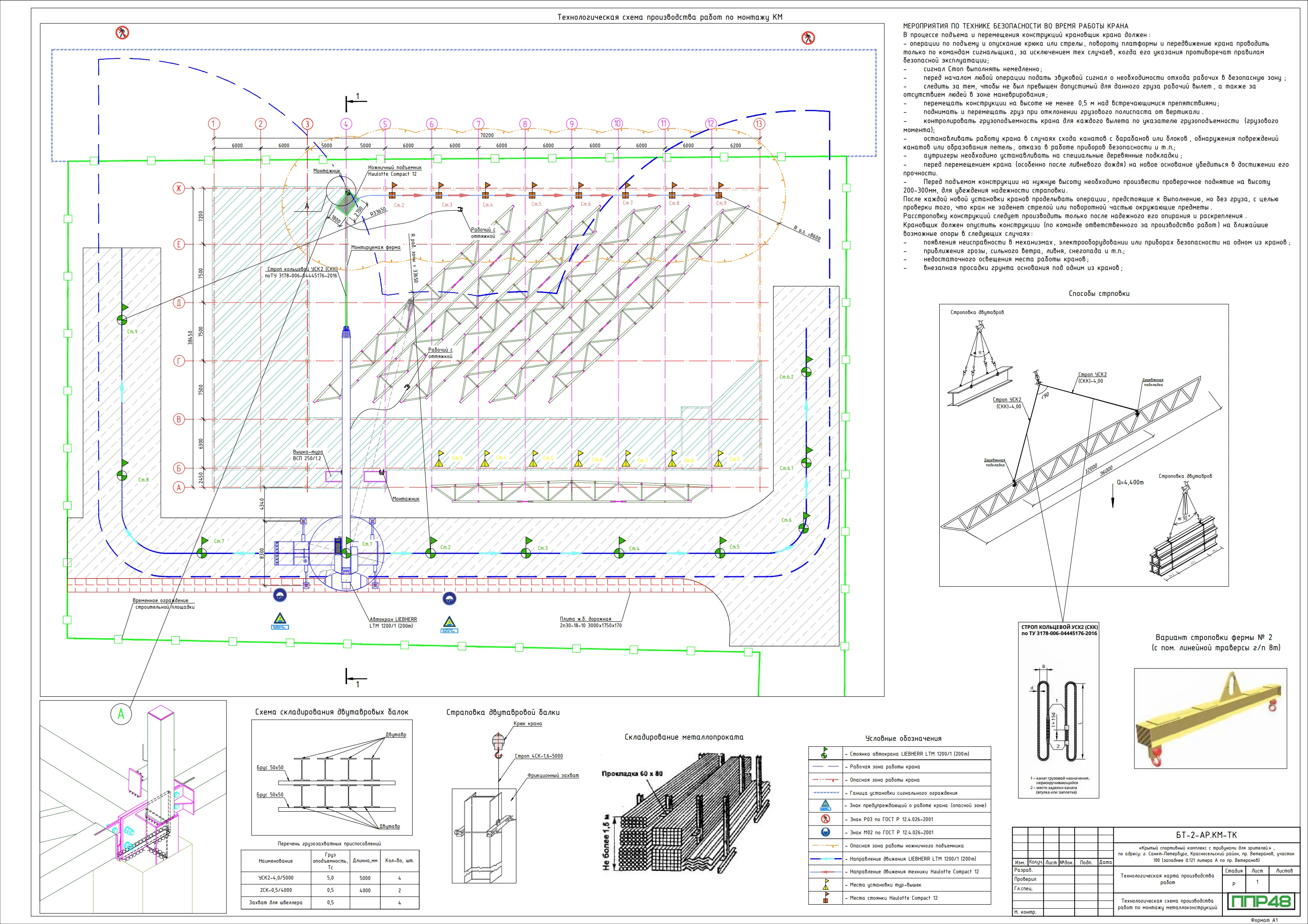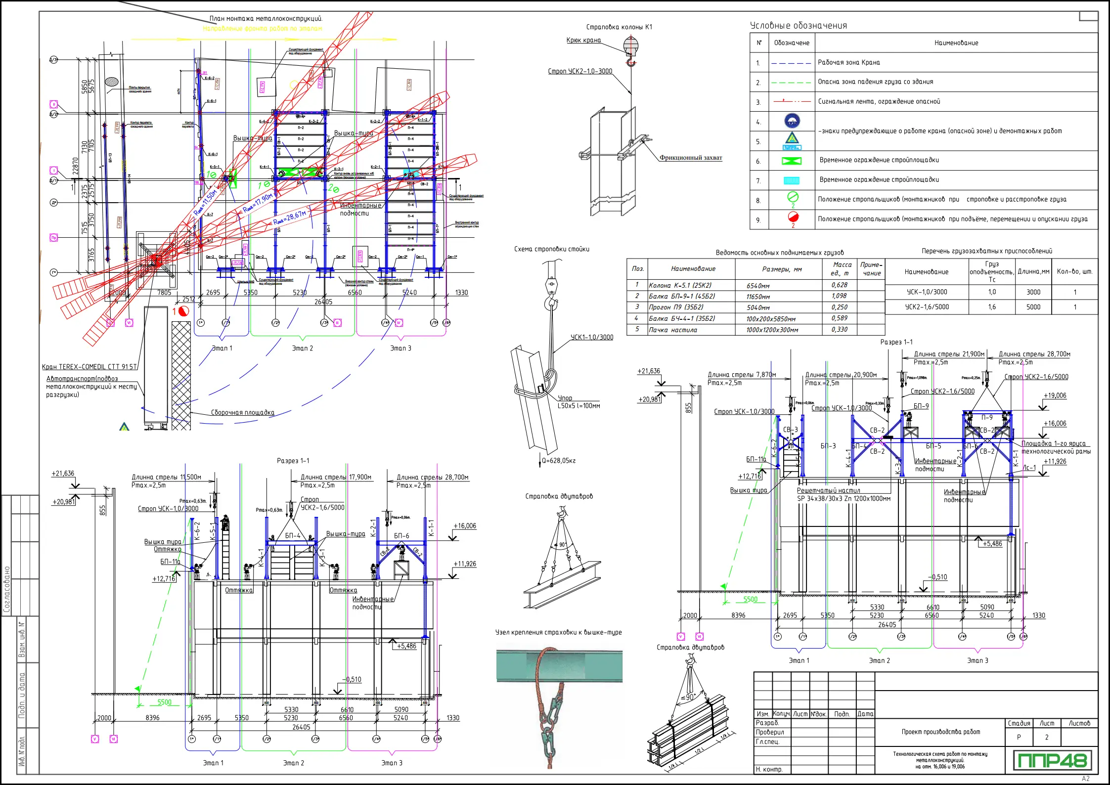 • этапы работ и взаимодействия грузоподъёмных механизмов, которые планируется задействовать в монтажных операциях;