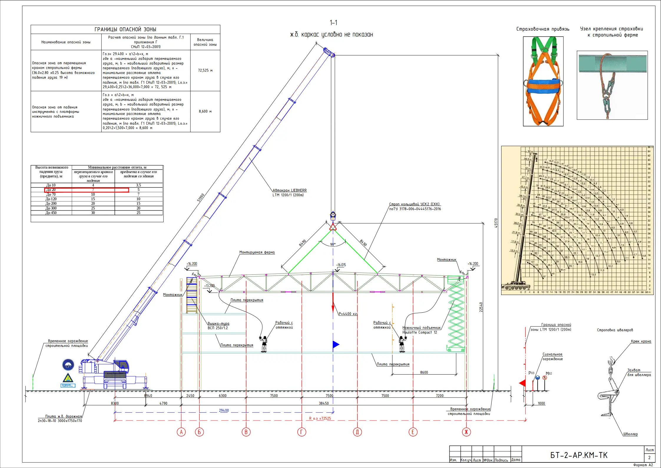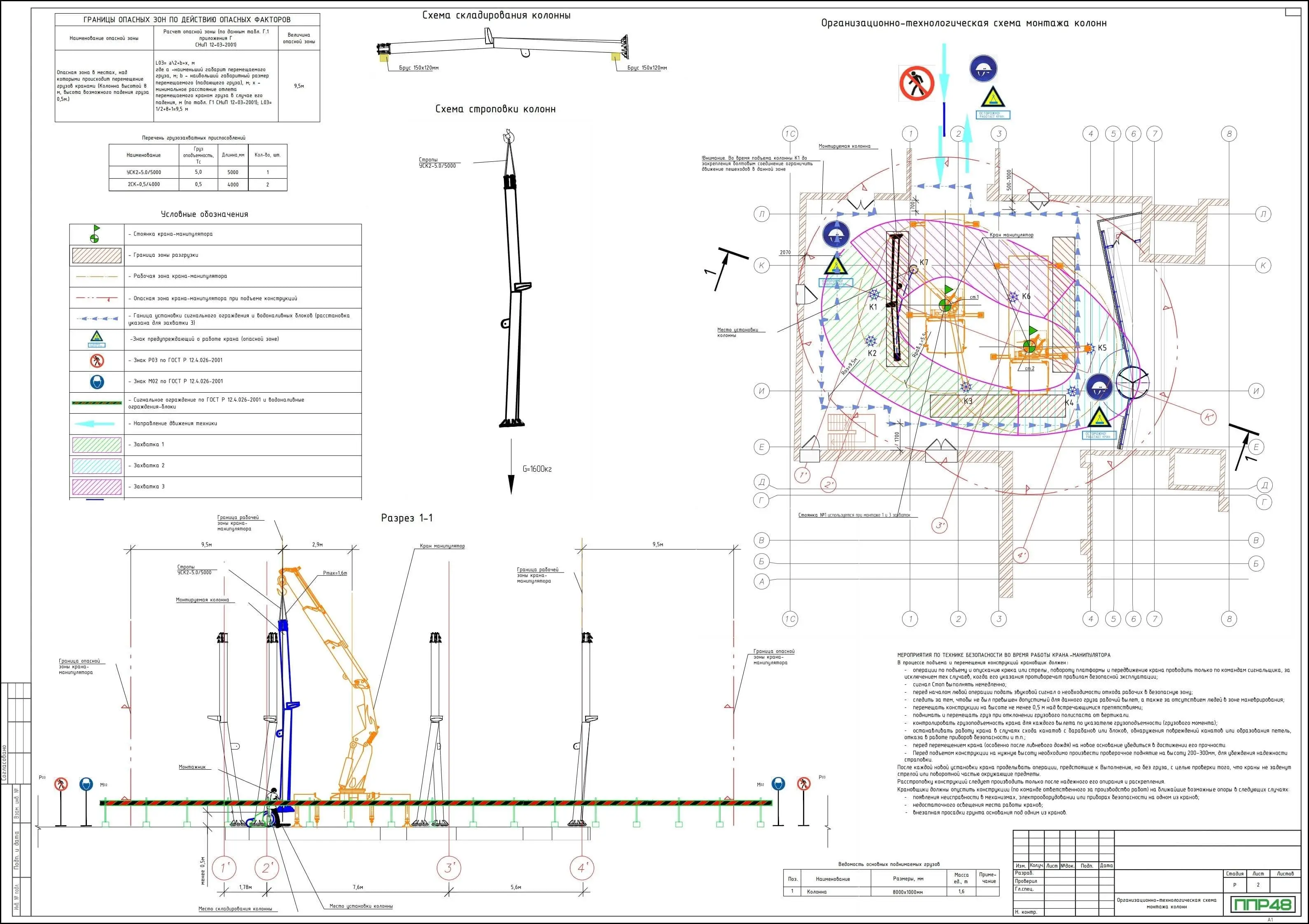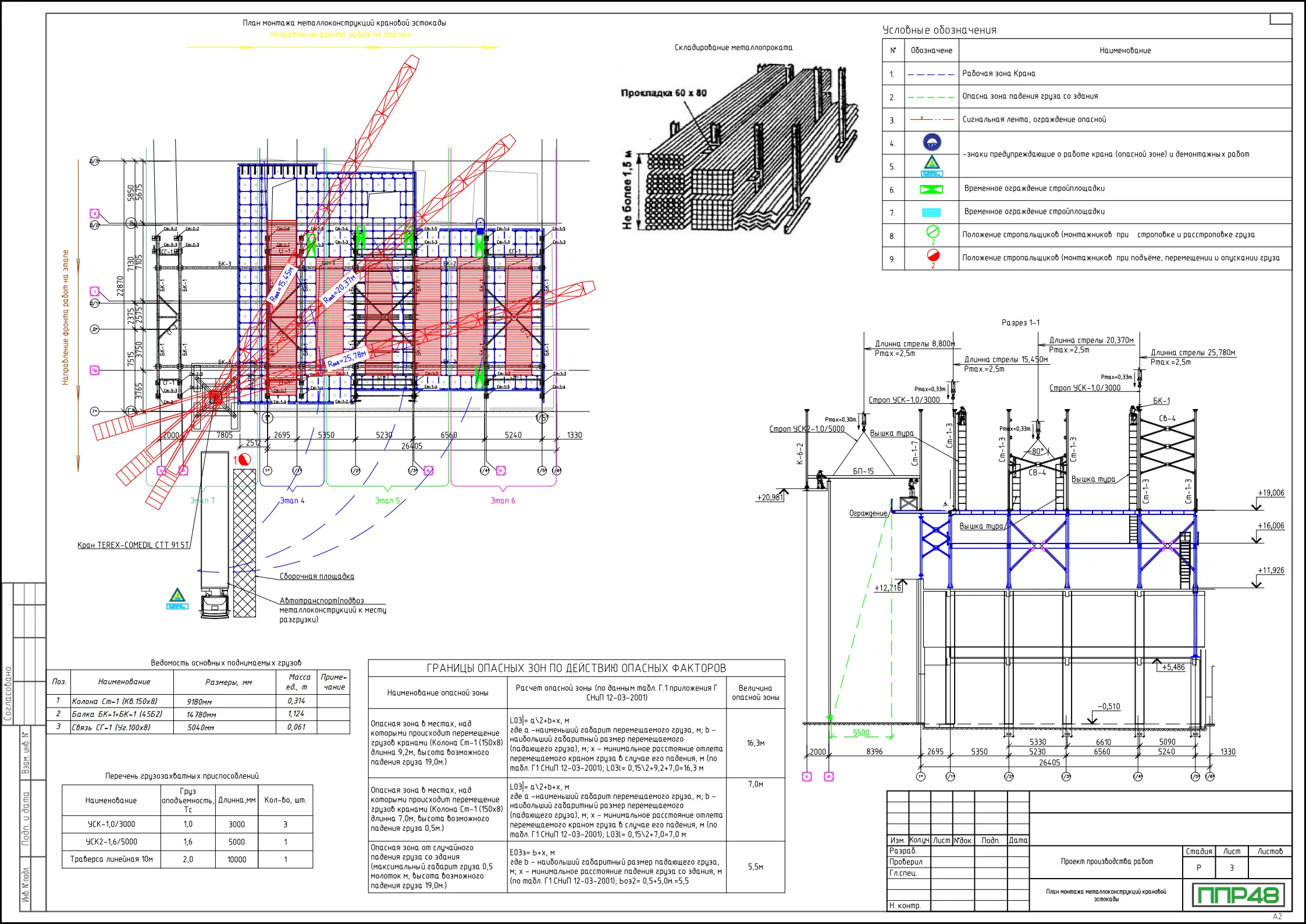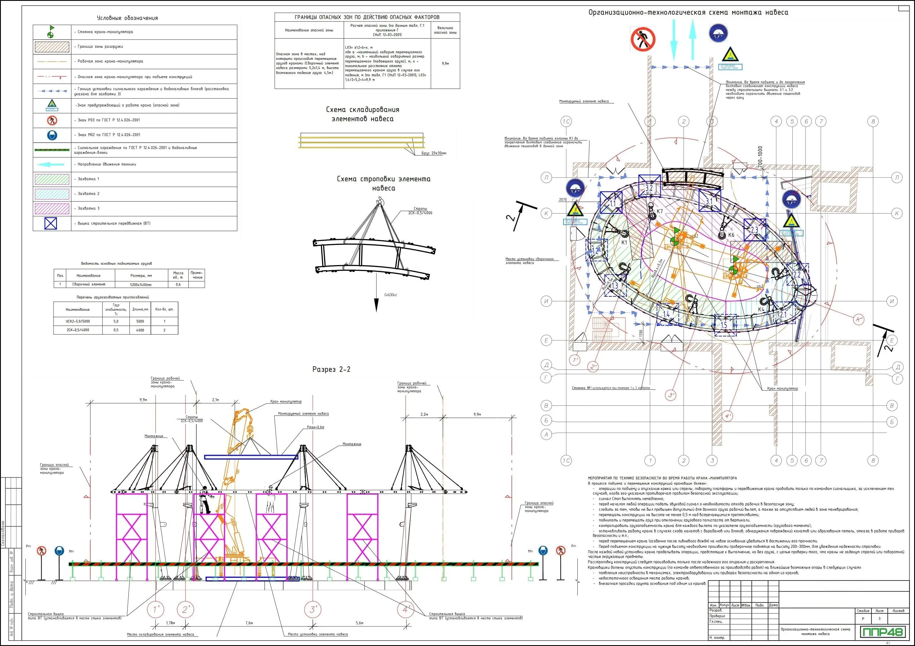 • этапы работ и взаимодействия грузоподъёмных механизмов, которые планируется задействовать в монтажных операциях;