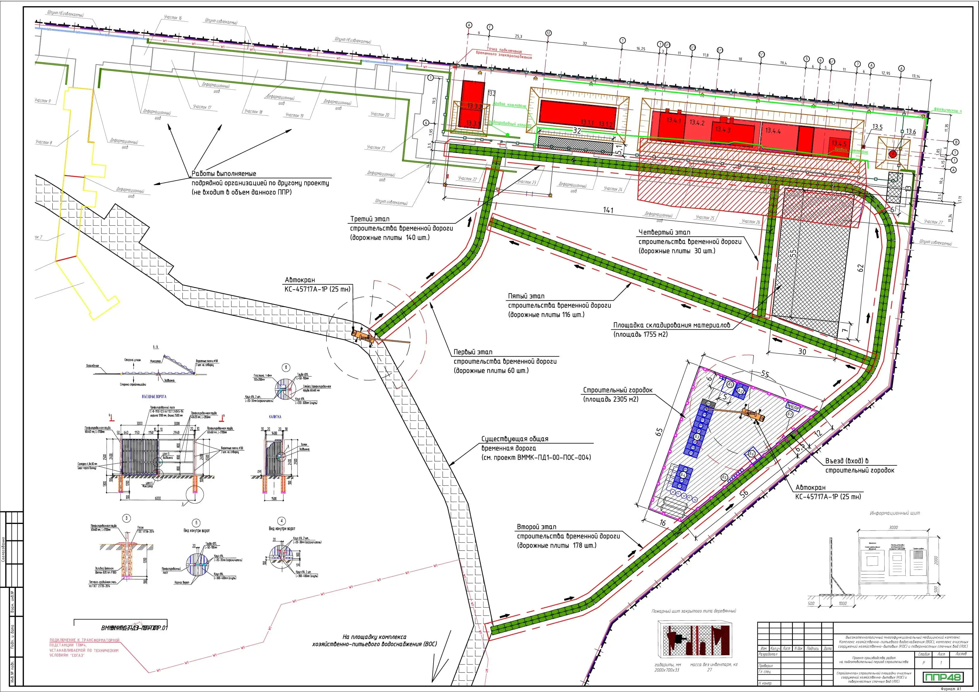 В разработке ППР на устройство строительного городка всегда необходимо учитывать последовательность выполнения работ. Зачастую мы начинаем свою работу с оформления подробного строительного генерального плана, на котором мы указываем размещение временных зданий и сооружений, бытовки, зоны стоянок строительной техники. Также мы отрисовываем в полном соответствии с ГОСТ 21.508-2020 внутриплощадочные дороги, показываем сети временного электроснабжения и электроосвещения.