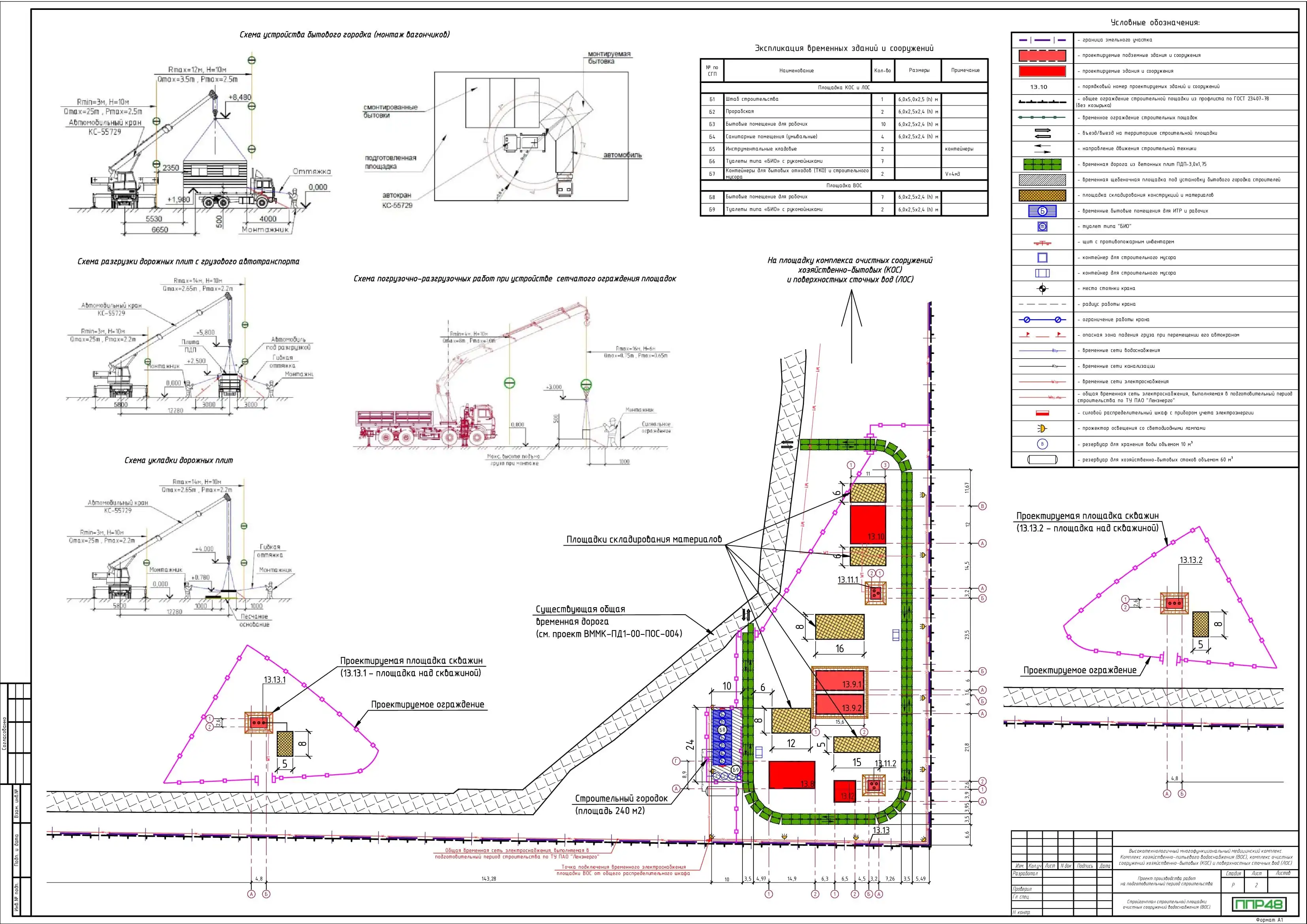 После выполнения качественного строительного генерального плана, мы синхронизируем всю информацию графической части с пояснительной запиской ППР, разрабатывая под каждый из вышеописанных подвидов работ отдельную технологическую карту (ТК) строительных процессов. Также мы дополняем ППР отдельной ТК на погрузочно-разгрузочные работы при разгрузке бытовок, с использованием кранов-манипуляторов, и в обязательном порядке включаем в проект раздел по охране труда при работе с подъемными сооружениями, а также раздел для охраны труда при производстве электромонтажных работ.